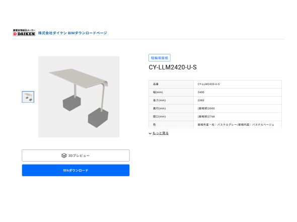 “3D自動変換機能”品番単位でRevit®ファミリの検索・ダウンロードができる検索サイトを、テンプレートから簡単に構築できます。また、BIMデータからサムネイル・3Dプレビュー生成ができるため、ブラウザ上でダウンロード前に内容を確認することもできます。既に製品検索サイトをお持ちの場合には、BIM関連機能だけを連携・追加する改修も承れます。