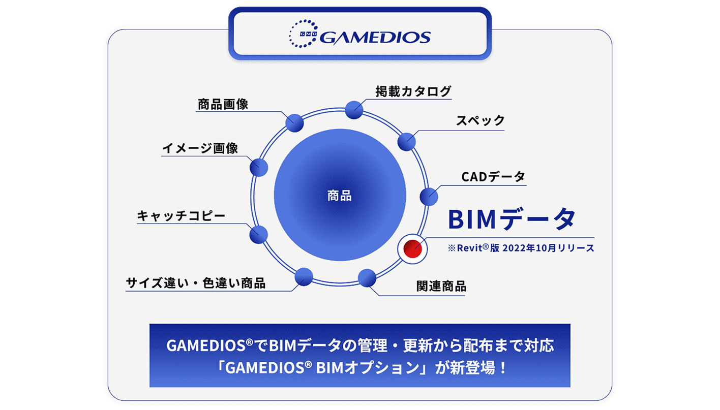 GAMEDIOS®(ガメディオス)は、商品に紐づく画像、テキスト、カタログデータなどの情報を統合的に管理できるデータベースサービスです。商品スペック項目の追加・変更が簡単に行えるなど、柔軟なデータベース構造が特徴です。2022年10月より、BIMデータにも対応しました。GAMEDIOS®について詳しくはこちらをご覧ください。